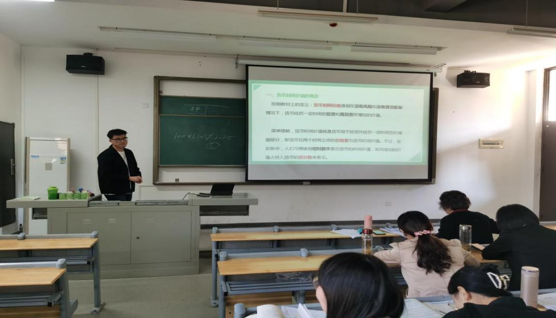 接下来,由第二轮磨课的新进教师白帆、宋雨萌、曾夏颖依次进行了限定时长为30分钟的授课。白帆老师主讲的是《财务管理学》的第二章内容,即货币时间价值。他首先以二十大会议精神作为思政元素,强调了高校教师立德树人的要义。紧接着,白帆老师对上一章教学内容进行了系统回顾,并结合生活中的小案例解释了货币时间价值的含义,最后结合案例进一步分析了货币时间价值的衡量方式,突出了本次课堂教学重点,课堂教学环节完整。